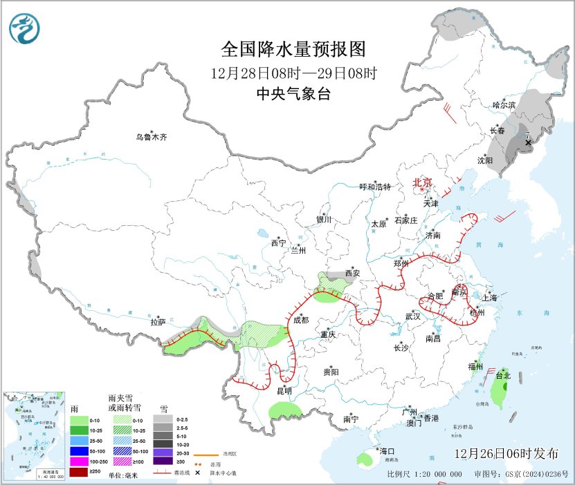 全国降水量预报图(12月28日08时-29日08时)