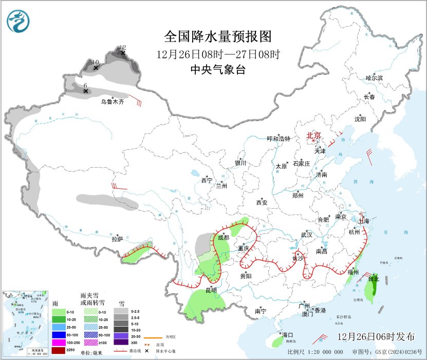 12月26日08时至27日08时,新疆南疆西部山区和北部、西藏北部和西部等地部分地区有小雪或雨夹雪,其中,新疆北疆北部高海拔地区有中到大雪,局地暴雪(10~12毫米)。西藏南部、四川东部和南部、云南东北部和南部、海南岛中部、台湾岛等地部分地区有小雨,其中,台湾岛东部部分地区有中雨。新疆沿天山地区、西藏北部、青海南部等地部分地区有5~6级风;东部和南部海域有7~8级风,阵风9级。