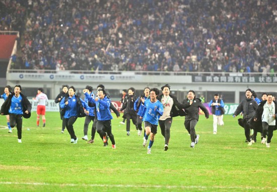12月21日,在2025湖南省足球联赛半决赛后,常德队庆祝胜利。 郭立亮 摄