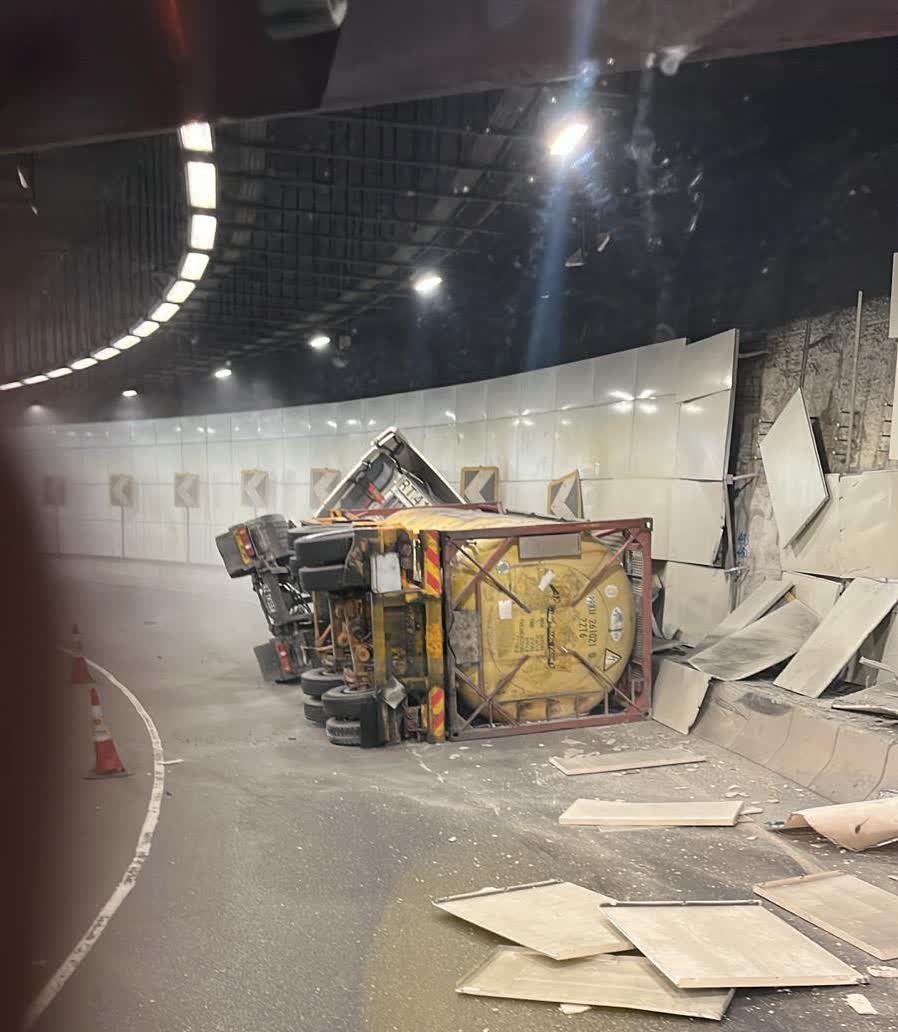 有網上圖片顯示,涉事泥頭車在一處彎位翻側,掃毀隧道右方多塊牆板,碎片散落一地。警方其後到場,並就事故原因展開調查。