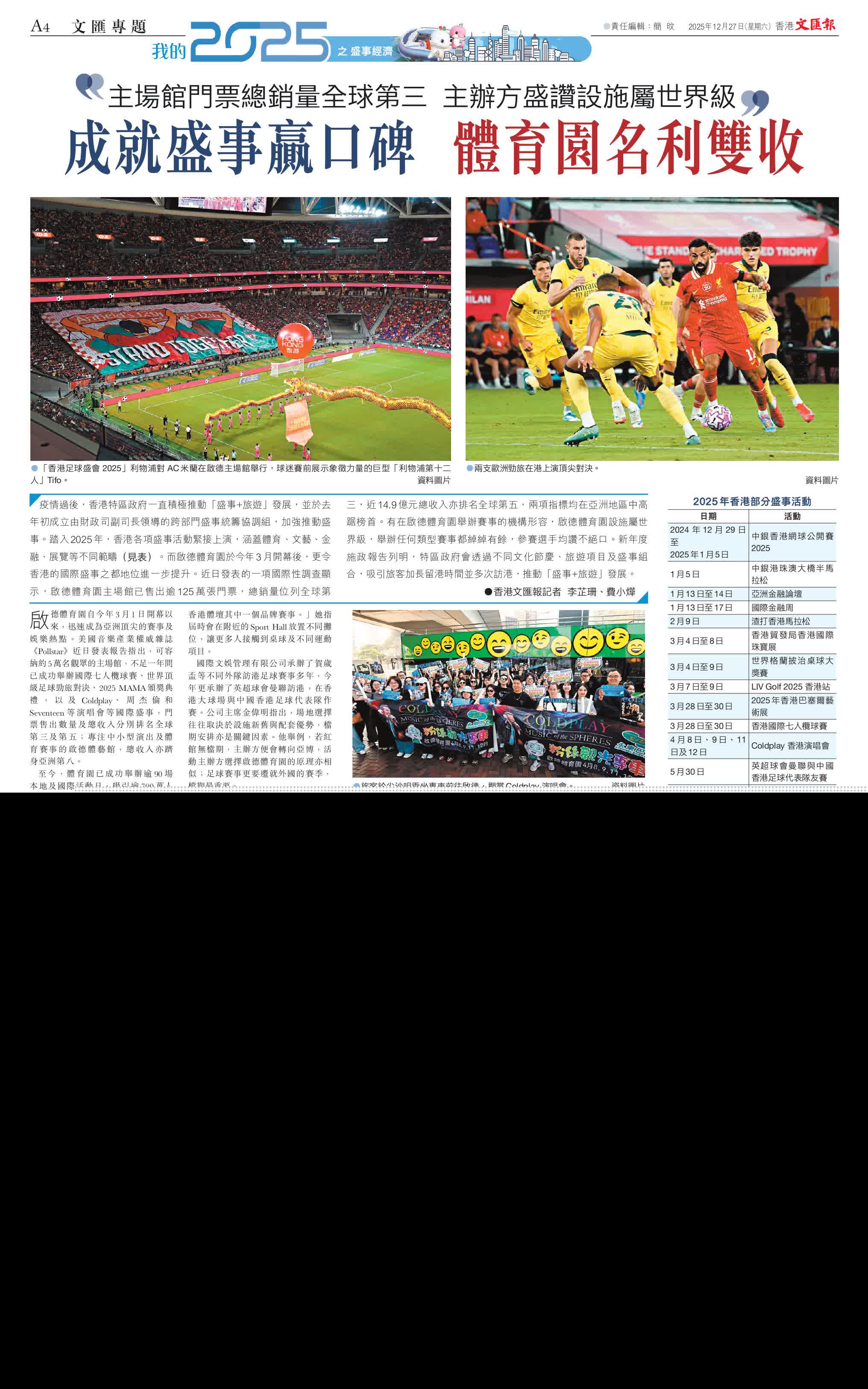 香港文匯報訊(記者 李芷珊、費小燁)疫情過後,香港特區政府一直積極推動「盛事+旅遊」發展,並於去年初成立由財政司副司長領導的跨部門盛事統籌協調組,加強推動盛事。踏入2025年,香港各項盛事活動緊接上演,涵蓋體育、文藝、金融、展覽等不同範疇(見表)。而啟德體育園於今年3月開幕後,更令香港的國際盛事之都地位進一步提升。近日發表的一項國際性調查顯示,啟德體育園主場館已售出逾125萬張門票,總銷量位列全球第三,近14.9億元總收入亦排名全球第五,兩項指標均在亞洲地區中高踞榜首。有在啟德體育園舉辦賽事的機構形容,啟德體育園設施屬世界級,舉辦任何類型賽事都綽綽有餘,參賽選手均讚不絕口。新年度施政報告列明,特區政府會透過不同文化節慶、旅遊項目及盛事組合,吸引旅客加長留港時間並多次訪港,推動「盛事+旅遊」發展。