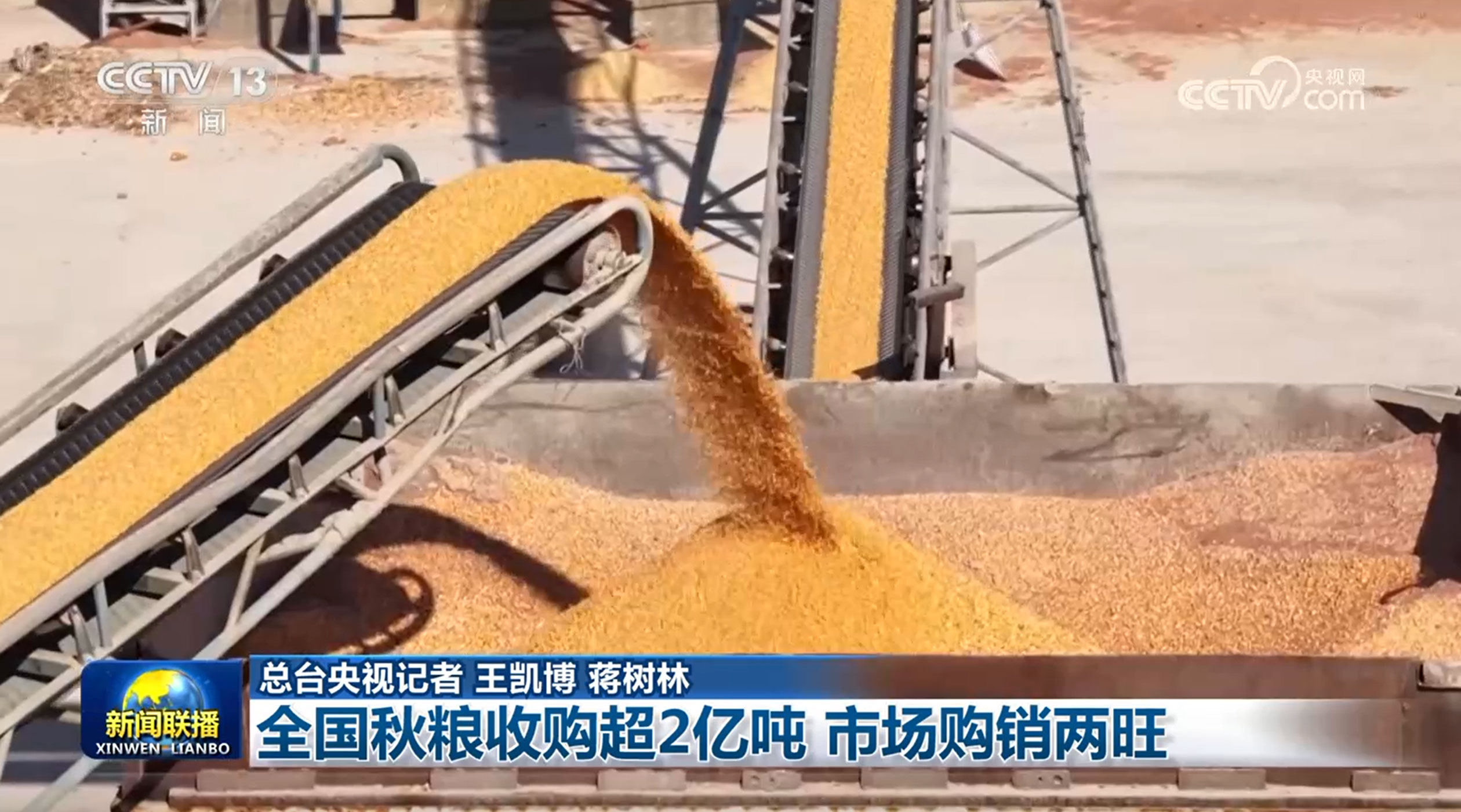 央视网消息(新闻联播):国家粮食和物资储备局最新发布,截至目前,全国秋粮收购量已突破2亿吨,同比增加3200万吨,创近年同期收购规模新高。