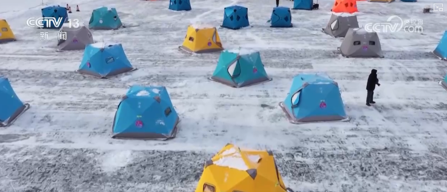 12月28日,在冰封的中俄界河上,五颜六色的冰钓暖帐整齐排开。来自中俄两国的冰钓爱好者,在冰天雪地里一边比赛,一边享受垂钓的乐趣。