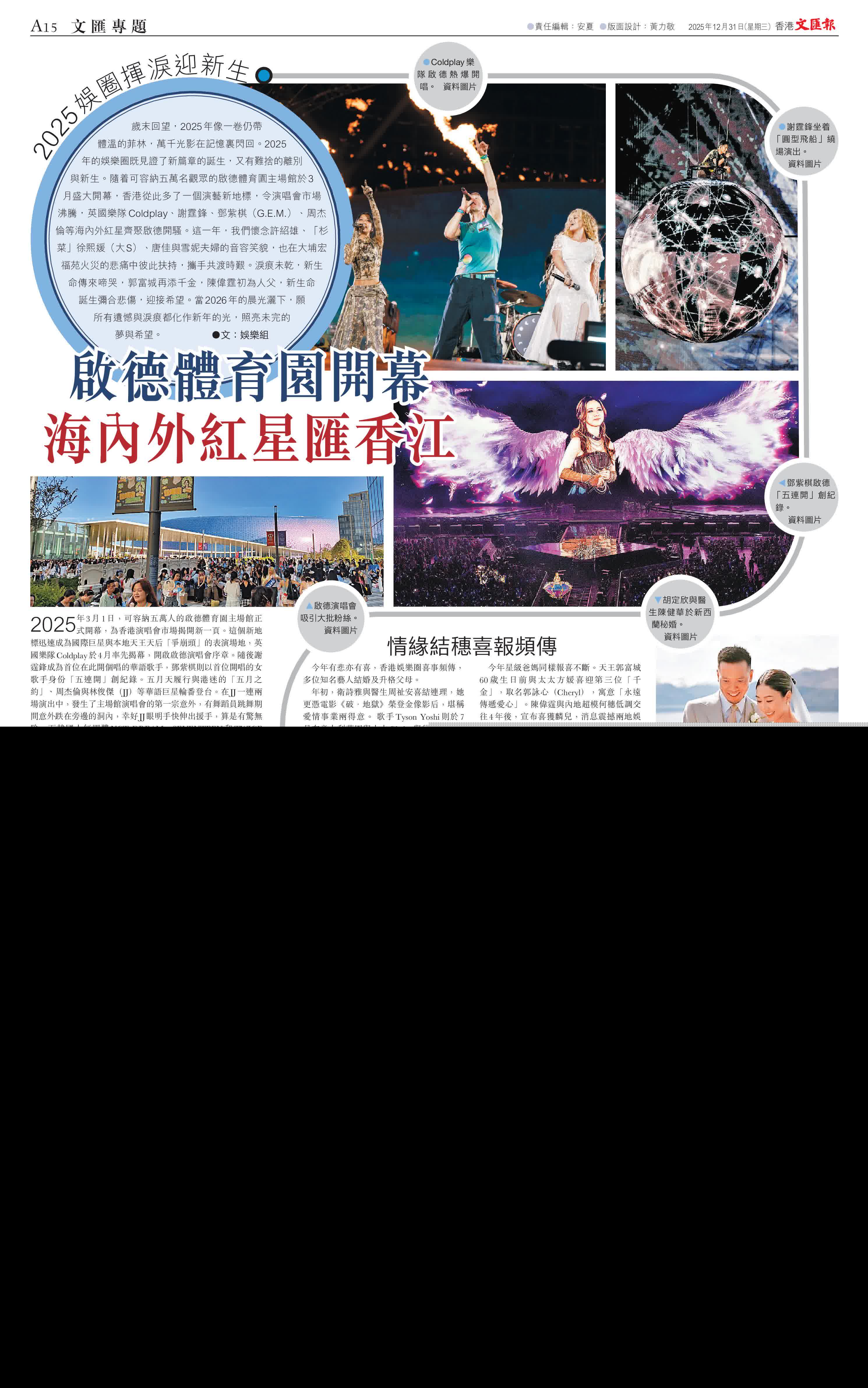 (香港文匯報娛樂組)歲末回望,2025年像一卷仍帶體溫的菲林,萬千光影在記憶裏閃回。2025年的娛樂圈既見證了新篇章的誕生,又有難捨的離別與新生。隨着可容納五萬名觀眾的啟德體育園主場館於3月盛大開幕,香港從此多了一個演藝新地標,令演唱會市場沸騰,英國樂隊Coldplay、謝霆鋒、鄧紫棋(G.E.M.)、周杰倫等海內外紅星齊聚啟德開騷。這一年,我們懷念許紹雄、「杉菜」徐熙媛(大S)、唐佳與雪妮夫婦的音容笑貌,也在大埔宏福苑火災的悲痛中彼此扶持,攜手共渡時艱。淚痕未乾,新生命傳來啼哭,郭富城再添千金,陳偉霆初為人父,新生命誕生彌合悲傷,迎接希望。當2026年的晨光灑下,願所有遺憾與淚痕都化作新年的光,照亮未完的夢與希望。