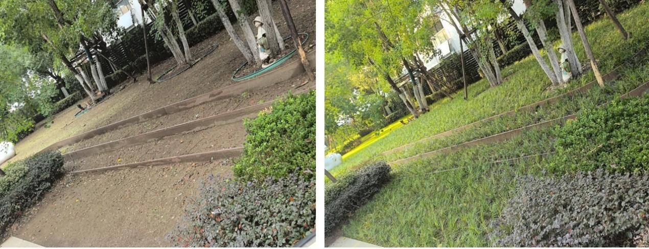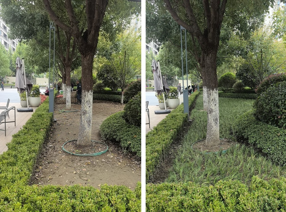 在园区绿化养护方面,项目今年已累计补种苗木34320株,并对园区内高大乔木实施了系统化修剪,通过专业的冠型梳理与精细修枝,在保持树木健康的同时,也营造出更疏朗有致的空间视觉。此外,团队还将部分易被踩踏的绿化区域,创新改造为既实用又美观的汀步小径。一位常在此散步的业主感慨:“原来这里总是秃一块,现在做成汀步,既保护了草,走起来也舒心,看着就舒服。”植被选择上也可见用心——以品相更佳的玉龙草逐步替换普通麦冬,这一细节让懂行的业主点头认可:“选材扎实,能看出是真的在用心打造园区。”