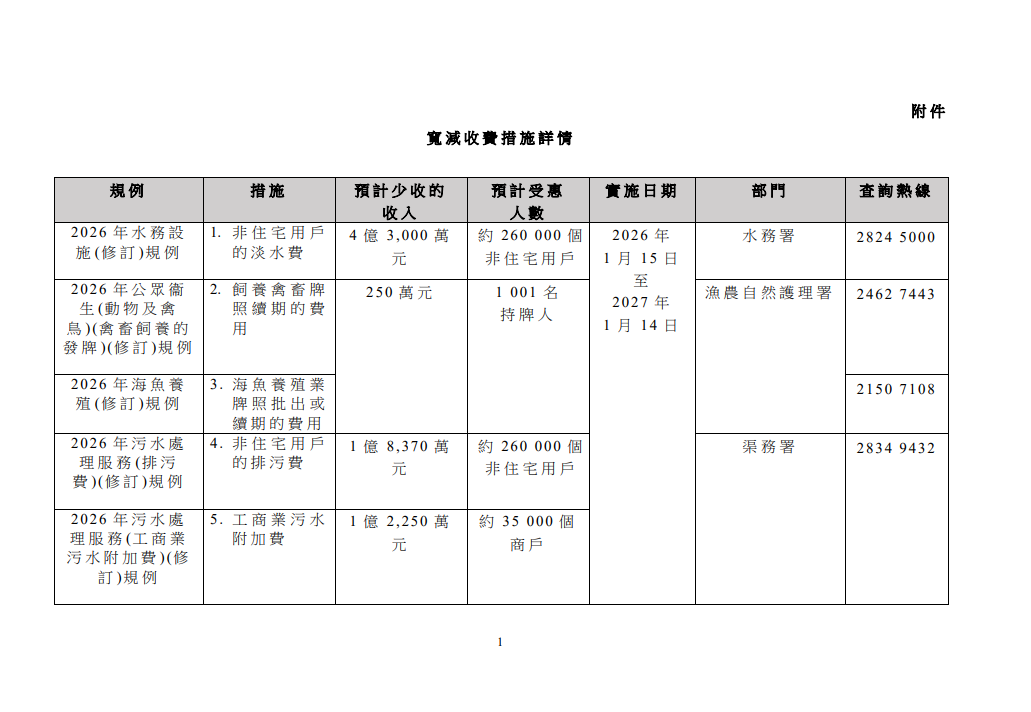 為落實行政長官在新一份施政報告公布的一系列支援中小企業的措施,政府今日(9日)在憲報刊登6項規例,以減收非住宅用戶50%的水費和排污費,每戶每月寬減額上限分別為1萬元及5千元;減收工商業污水附加費50%;以及豁免指明漁農業牌照和酒牌的首次簽發或續期的費用。