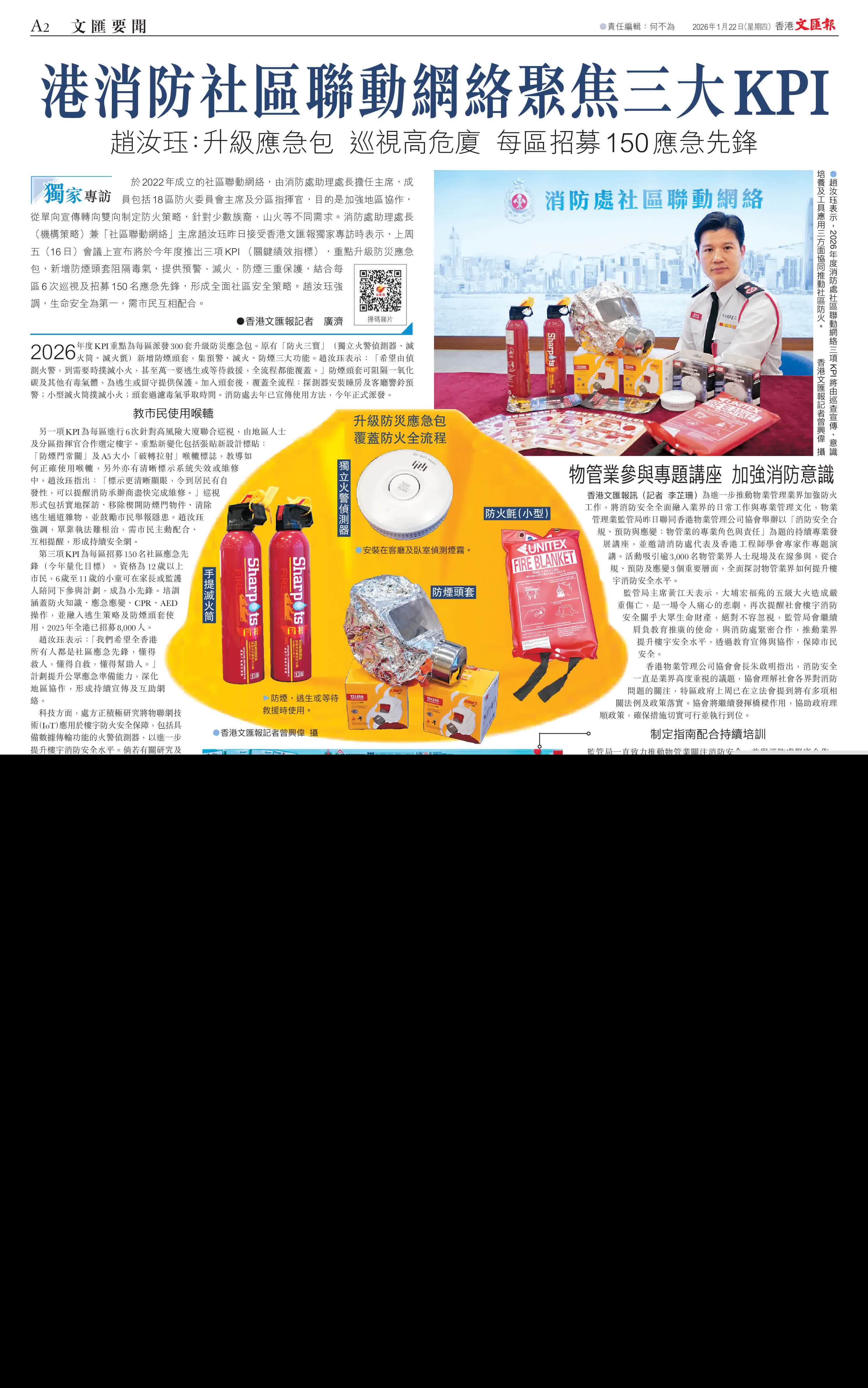 (香港文匯報記者 廣濟)於2022年成立的社區聯動網絡,由消防處助理處長擔任主席,成員包括18區防火委員會主席及分區指揮官,目的是加強地區協作,從單向宣傳轉向雙向制定防火策略,針對少數族裔、山火等不同需求。消防處助理處長(機構策略)兼「社區聯動網絡」主席趙汝珏昨日接受香港文匯報獨家專訪時表示,上周五(16日)會議上宣布將於今年度推出三項KPI(關鍵績效指標),重點升級防災應急包,新增防煙頭套阻隔毒氣,提供預警、滅火、防煙三重保護,結合每區6次巡視及招募150名應急先鋒,形成全面社區安全策略。趙汝珏強調,生命安全為第一,需市民互相配合。