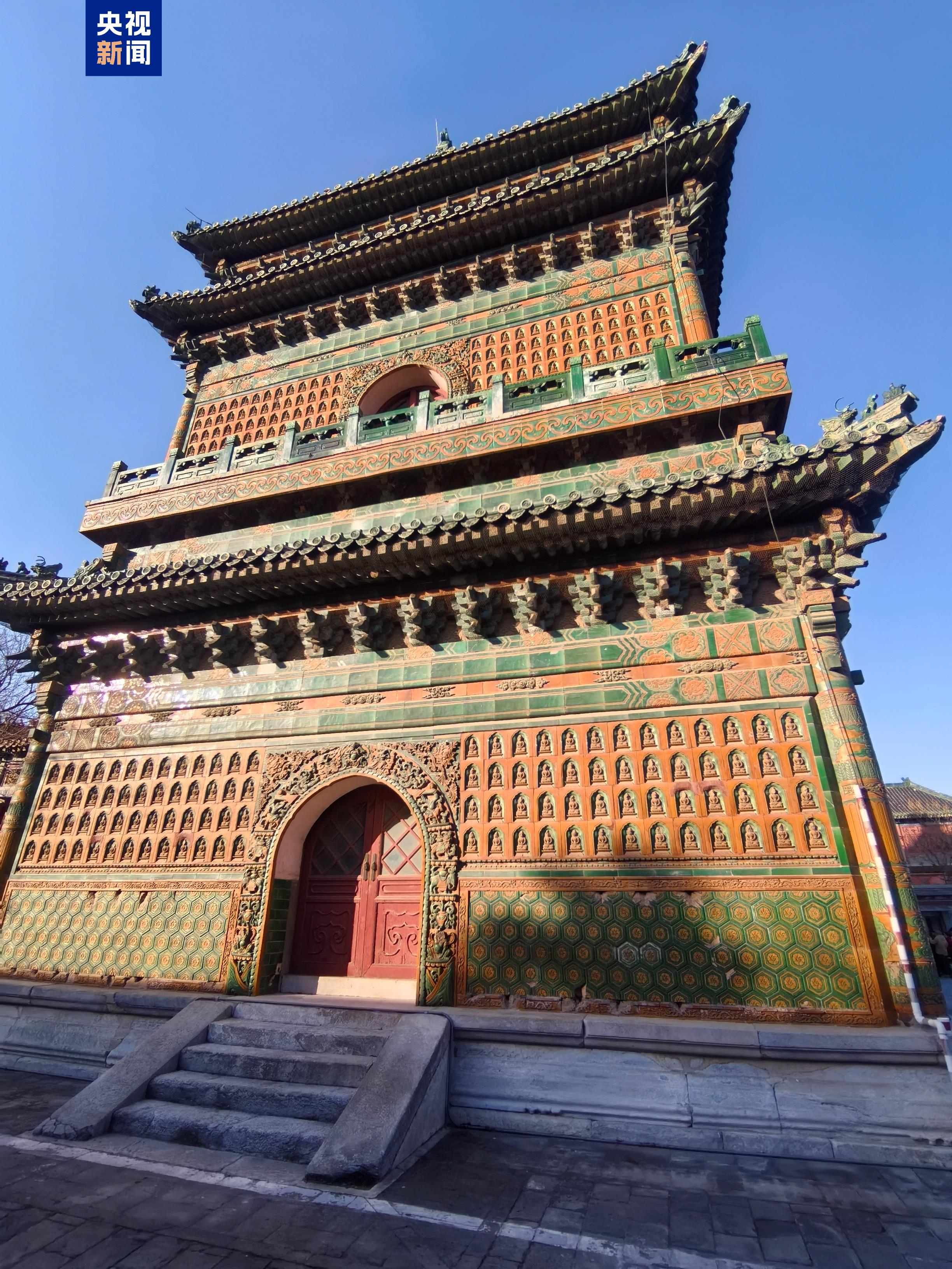 琉璃阁院落是北海公园“西天梵境”建筑群的重要组成部分,位于其第三进院落,建筑依次为重檐歇山华严清界殿、重檐攒尖七佛塔亭、三覆檐歇山琉璃阁。琉璃阁建于乾隆二十四年(1759年),七佛塔亭建于乾隆四十二年(1777 年),是清代中期皇家园林建筑营造的典范,是中华民族多元一体、文化交融的重要象征。琉璃阁立面镶嵌1424尊无量寿佛琉璃像,是全国少见的清代官式琉璃建筑;七佛塔亭内八角石塔上刻七世佛和乾隆御笔所书《七佛塔碑记》,全国仅此一例,展现了中国古代建筑的高超技艺与工程智慧。