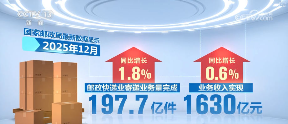 国家邮政局最新数据显示,2025年12月,我国邮政快递业寄递业务量完成197.7亿件,同比增长1.8%;业务收入实现1630亿元,同比增长0.6%。