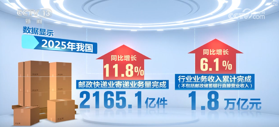 数据显示,2025年,我国邮政快递业寄递业务量完成2165.1亿件,同比增长11.8%。行业业务收入(不包括邮政储蓄银行直接营业收入)累计完成1.8万亿元,同比增长6.1%。均创新高。