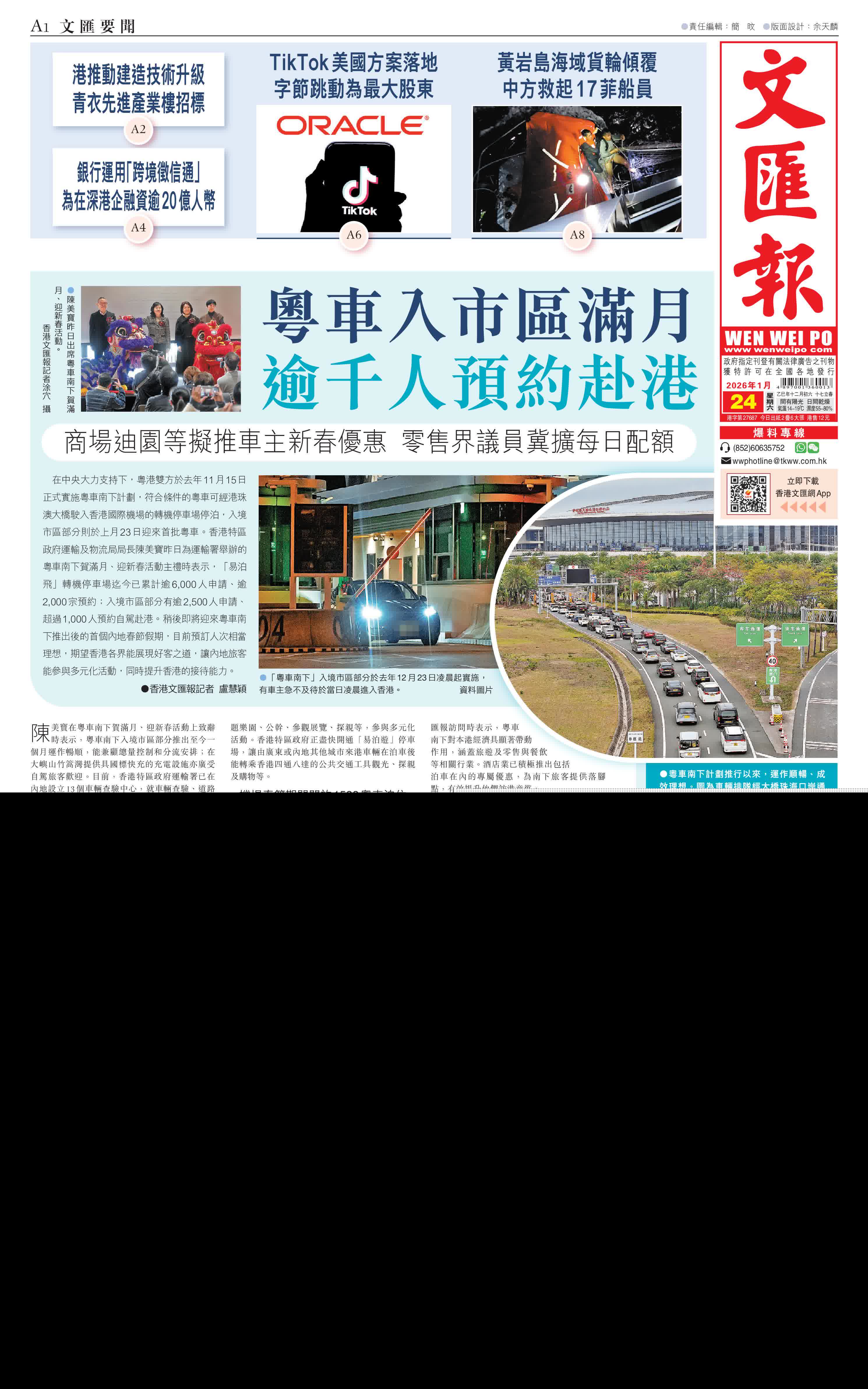 (香港文匯報記者 盧慧穎)在中央大力支持下,粵港雙方於去年11月15日正式實施粵車南下計劃,符合條件的粵車可經港珠澳大橋駛入香港國際機場的轉機停車場停泊,入境市區部分則於上月23日迎來首批粵車。香港特區政府運輸及物流局局長陳美寶昨日為運輸署舉辦的粵車南下賀滿月、迎新春活動主禮時表示,「易泊飛」轉機停車場迄今已累計逾6,000人申請、逾2,000宗預約;入境市區部分有逾2,500人申請、超過1,000人預約自駕赴港。稍後即將迎來粵車南下推出後的首個內地春節假期,目前預訂人次相當理想,期望香港各界能展現好客之道,讓內地旅客能參與多元化活動,同時提升香港的接待能力。