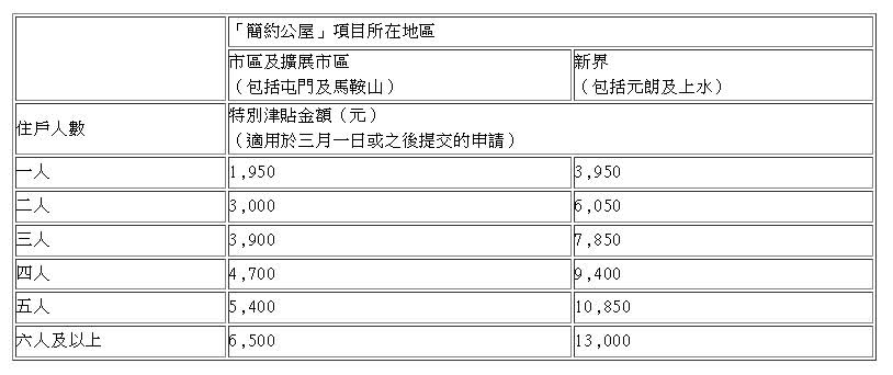 與現時一樣,擴展後的「試驗計劃」會繼續為「簡約公屋」住戶提供一次性特別津貼,減輕他們於搬遷和適應新居住環境和社區時的開支壓力(例如子女轉校、添置家具電器、重新建立社區網絡等)。津貼不設用途限制,讓住戶更靈活地應付各自需要。因應生活成本上漲,「試驗計劃」的特別津貼金額稍微上調,新金額會於3月1日起生效。視乎住戶同住的家人數目和入住項目的地區,有關津貼金額表列如下: