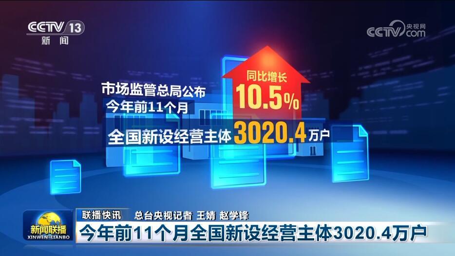 今年前11个月全国新设经营主体3020.4万户
